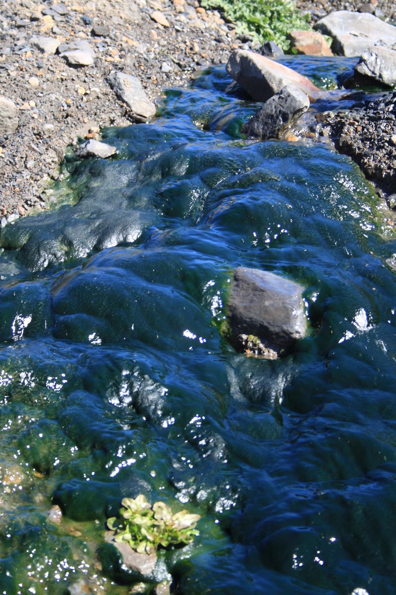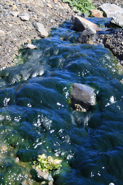 Doy media vuelta sobre el pequeño puente desde el que acabo de tomar la foto anterior para ver a mis pies el lugar de confluencia de dos arroyos: el de la izquierda es el Valmayor y el otro -donde proliferan las algas- es el de La Mora. La suma de ambos da lugar al Luna.